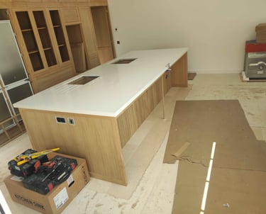 Beaucoup de Marbre blanc que ce soit coté cuisine, dans les douches, et même ici dans le salon sous les protections.